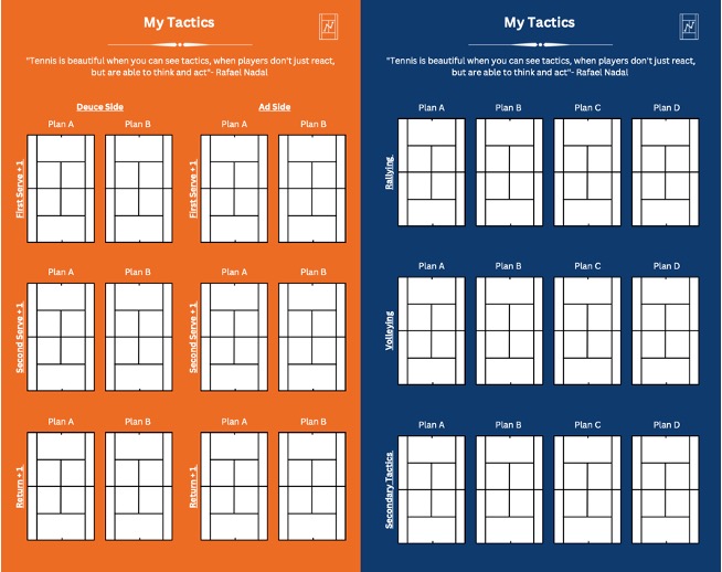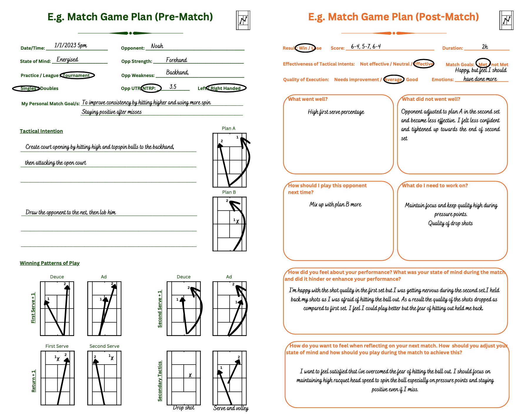 - Match gameplan (Sample Shown) – to record detailed plan and outcome of each match