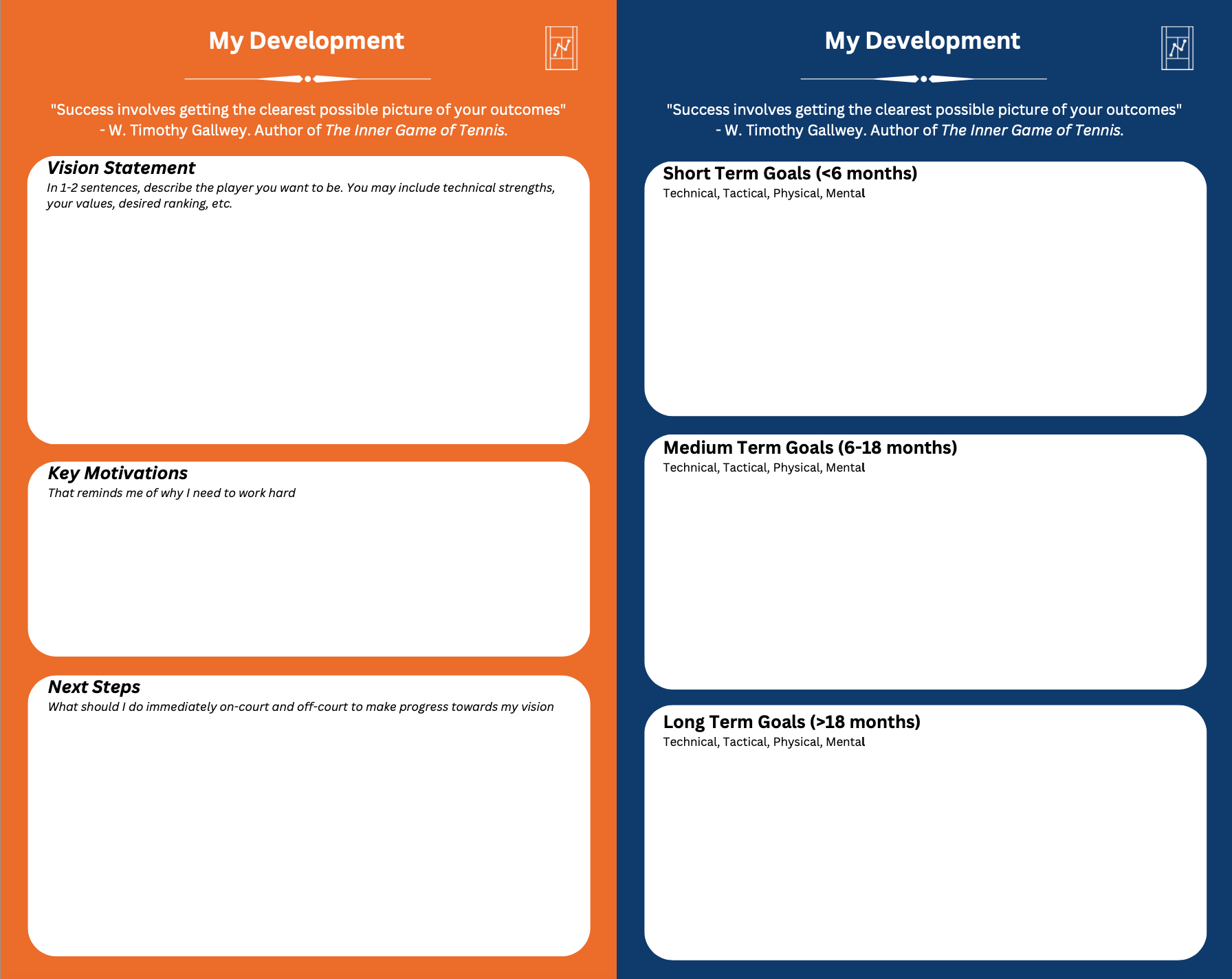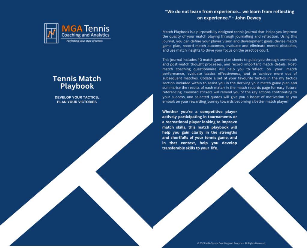 This 100-page tennis development tool that enables a player to define his/her development goals, improve the quality of match playing, and use matchplay insights and personal reflections to drive the focus on practice court. It features 40 match gameplan sheets for the player to devise and record gameplay and outcome of each match and coaching questionnaire to invoke personal reflection and to achieve more out of subsequent matches.