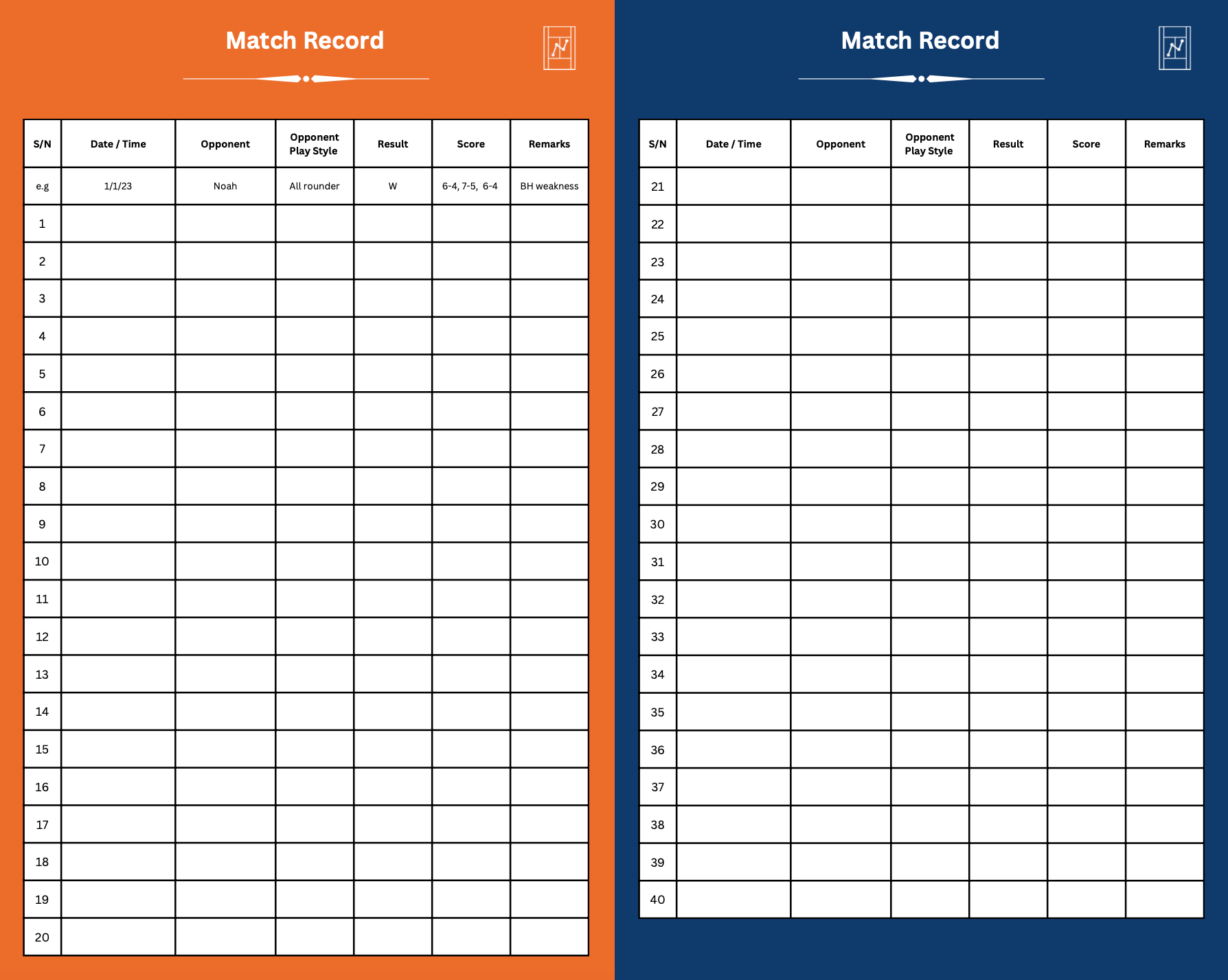 - Match records – a 1-page summary of all match outcomes for easy future reference